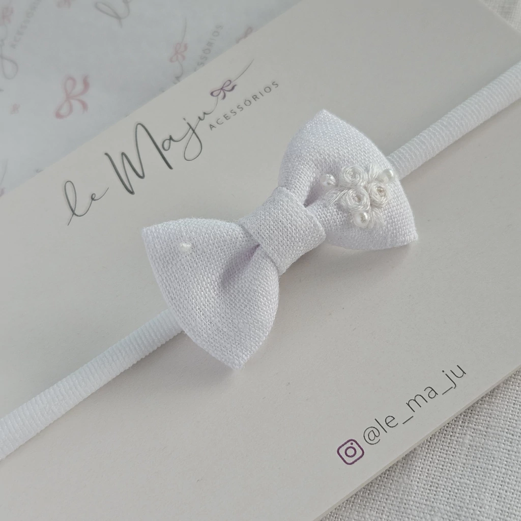 Para o primeiro aninho de vida, recomendamos a faixinha de nylon. Ela é super confortável e estica bastante, sem risco de apertar a cabecinha da sua bebê.