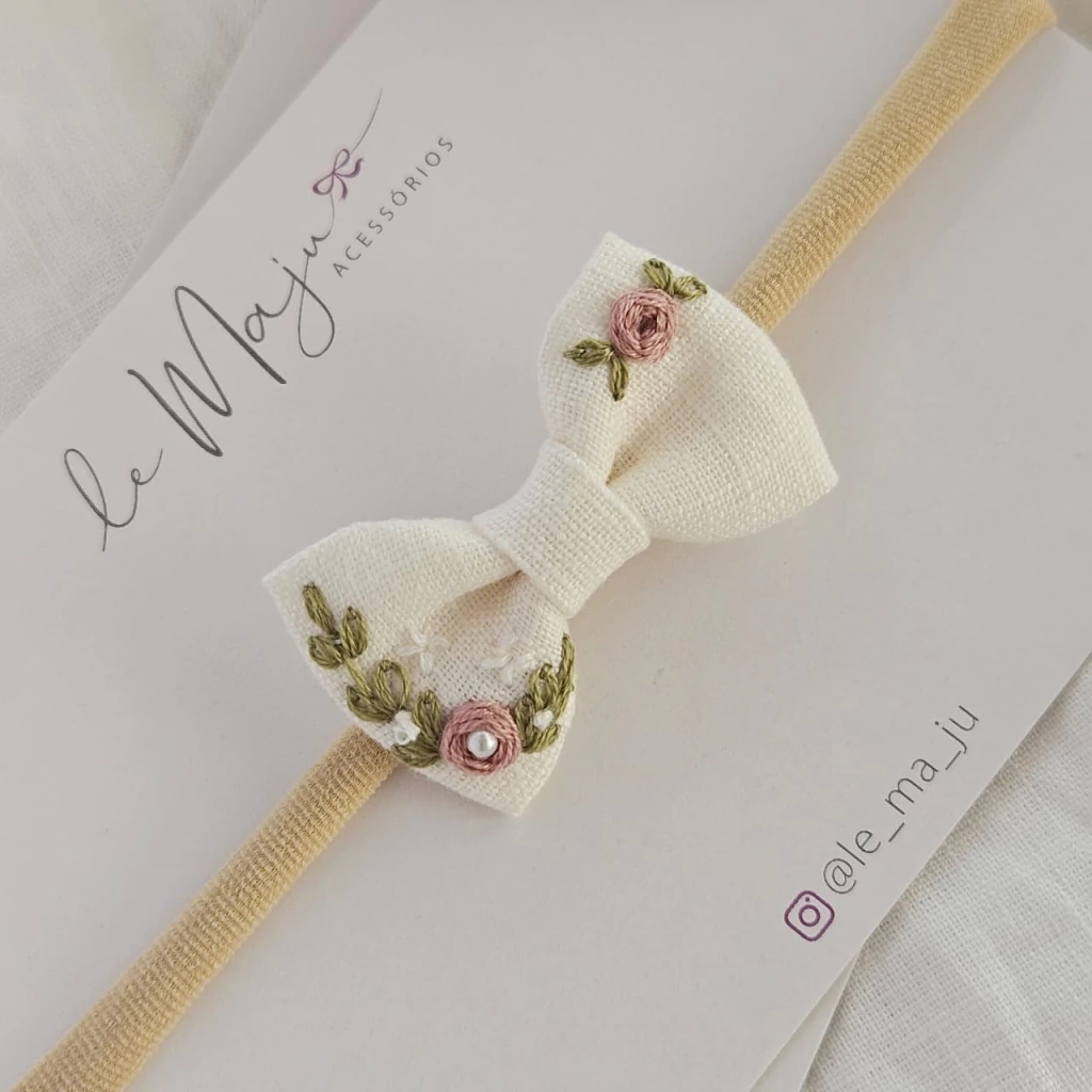 Para o primeiro aninho de vida, recomendamos a faixinha de nylon. Ela é super confortável e estica bastante, sem risco de apertar a cabecinha da sua bebê.